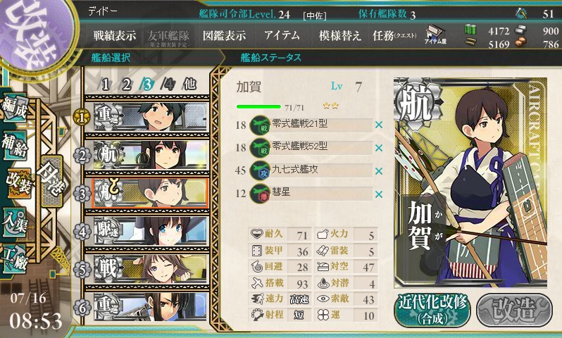 個人的に、零戦は21型または22型が至高と信じるあたしにとって、52型の方がレア装備で高性能という点がちょっといただけませんが、まあこれは艦船が主人公のゲームなわけだし、、、ゴニョゴニョ。