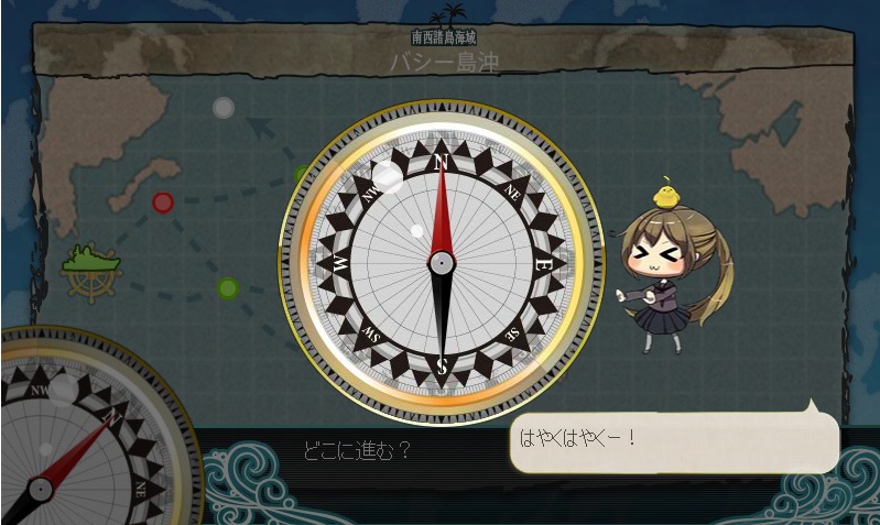 マップと出撃艦隊を指定したら、マップ内にいくつかあるルートを進んでいくわけですが、どのルートを進むのかは、羅針盤という名前のルーレットで決まる仕様。